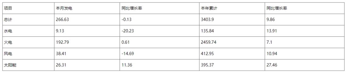 (一)發(fā)電量情況。11月份當(dāng)月,全省發(fā)電量266.63億千瓦時(shí),同比下降0.13%。其中水電9.13億千瓦時(shí),同比下降20.23%;火電192.79億千瓦時(shí),同比增長(zhǎng)0.61%;風(fēng)電38.41億千瓦時(shí),同比下降14.69%;太陽(yáng)能26.31億千瓦時(shí),同比增加11.36%。